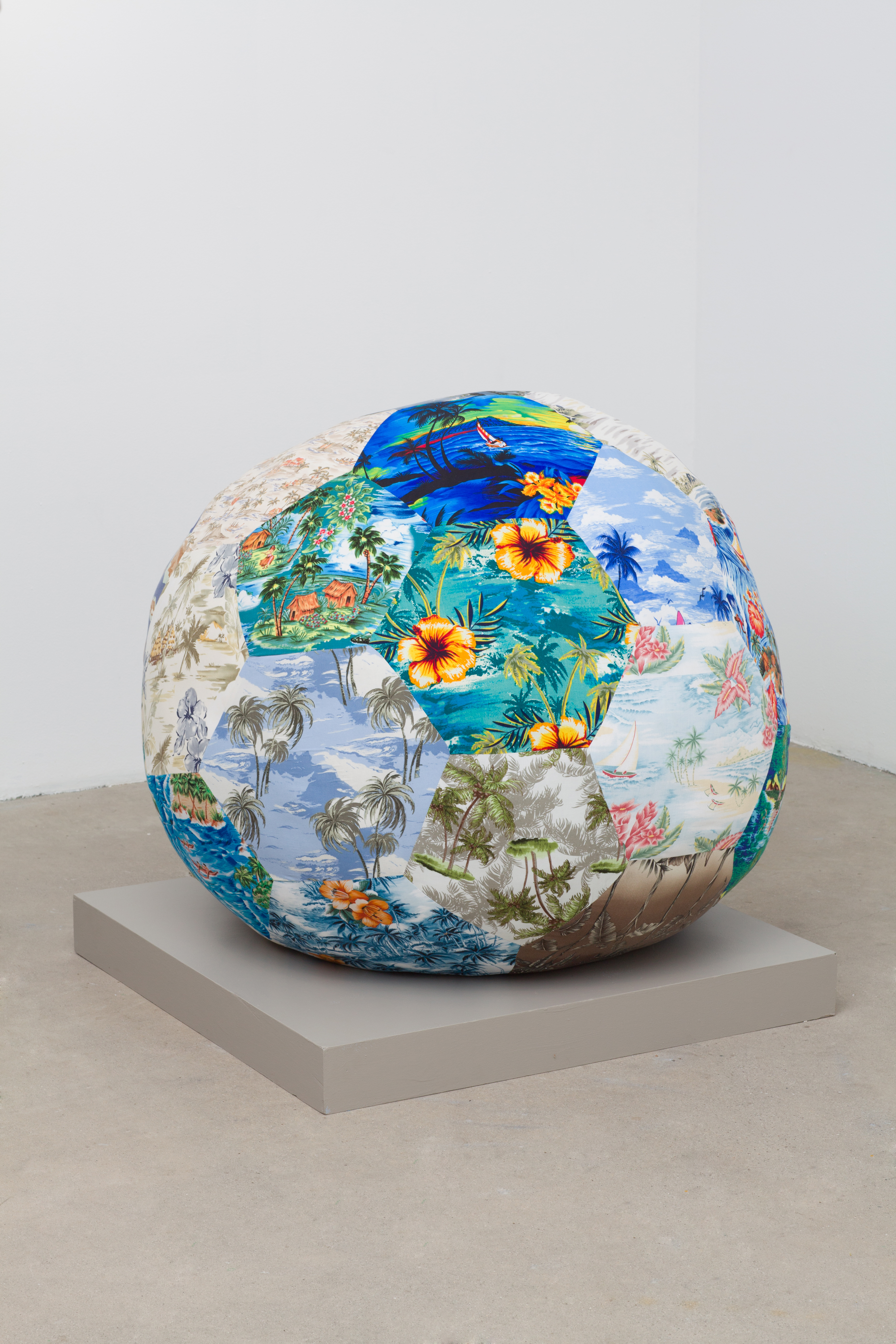 Suggestive of shelter, community, cohabitation, and Buckminster Fuller’s vision of “Spaceship Earth,” Mendoza’s subtle sculptures meditate on space and place, ecosystems, and the catalyzing influence of immigrants. Thinking about traveling away from our native terrestrial home to search other planets, we must consider how we will bring samples back to Earth in our Balikbayan spaceships of the future. On the surface of Mendoza’s sculptures, which is all we can see but not imagine, play a myriad of familiar icons. The references in Global to beach culture with its stereotypical Hawaiian shirts, and the wooden siding from the classic California bungalow architecture in house both suggest California’s exponential population growth and ultimately bring the sculptures home.
