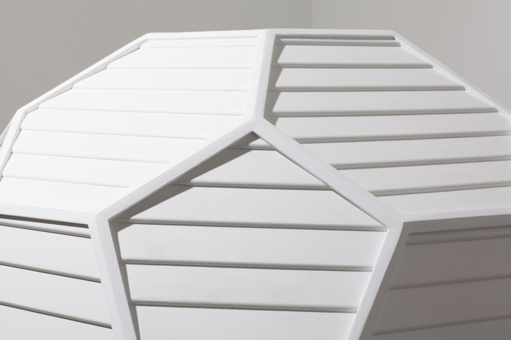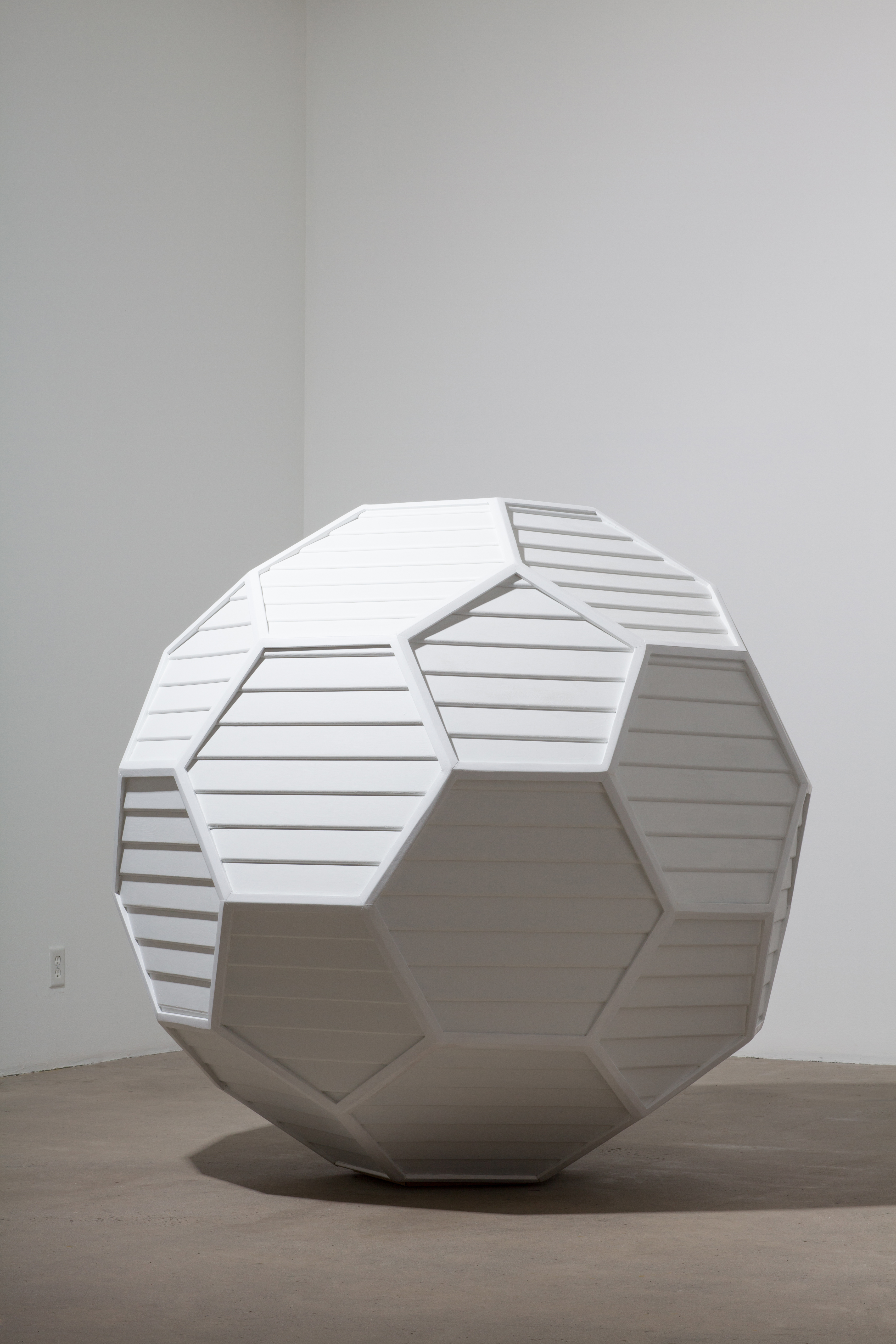 The parenthetical title of the piece house (Fullerene) imputes yet another layer of complexity to Mendoza’s funny and charming sculptures. Fullerene is the name of a large molecule that forms a polyhedron of carbon atoms. It can be closed like a sphere or form long nanotubes. Fullerenes are stronger than their allotropic cousins, graphite and diamonds, and are thought to be plentiful in the universe. In fact, as long chain carbon molecules are progressively discovered in the intergalactic medium, they have now created a treasure-hunting atmosphere amongst astrophysicists studying the evolution of planets. In 2010, when astronomers using the Spitzer Space Telescope found fullerene (also known as C60) in space, they had identified the largest molecule yet to be found in space.[2]