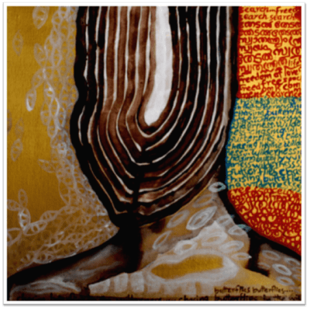 This woman, Sajitha knows, cannot contain her thoughts of the past, which are too painful. She must, through meditation, learn to live in the moment. Thus, Sajitha depicts herself as continuing an ancient Indian tradition and reflects her own experience practicing meditation – an intrinsic element in yoga and a practice that evolved in India as a means to transcend suffering. This same lotus position is used in representing not only Shiva, the meditating ascetic God of Hinduism, but also in Buddhist and Jain imagery. Sajitha’s adaptation of this posture is poignant, evoking her own painful experience in life. Throughout her mature artwork, Sajitha continues to mine Indian culture for its clues to perception.