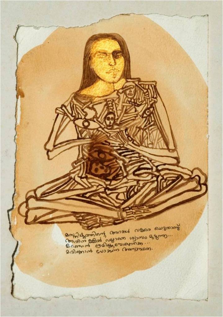 At this time, as Sajitha returned to her practice of using her own body in her painting, she wrote, “The way to knowledge is our body,” as she drew a sketch of herself “in a meditating pose” in her diary.[10] The next day, she observed, “When you enter into your own body [yo]u can see the whole world.” [11] It was out of this ferment that Sajitha created her new Alterbodies series. She started with a small figure drawing on paper that is a self-portrait seated in a yoga lotus position. Her body appears like a skeleton, composed of bones without any flesh. Below this figure are lines of her poetry written in Malayalam: “The rooms of the brain are too small. Whenever I tr[ied] to sleep, I felt suffocated, and felt like I was dying.”