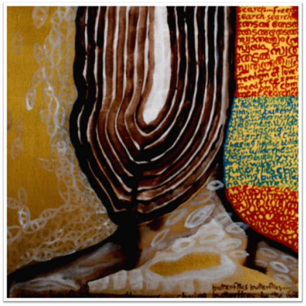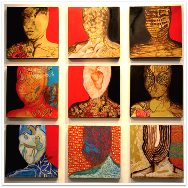 Sajitha made a series of self-portraits, continuing to explore the self. She likes to exhibit them in groups of nine, referring once again to the “nine planets” in Hindu texts. On one painting from a nine-part Alterbodies series of her heads, she has written “Nissanghatha” in Malayalam, which means “non-attachment.” “It’s a kind of reflection of the city on the body,” she explains. “How sensitive we are, [and that] we are unaware of this.” Sajitha survived her self-imposed exile in Delhi and returned home to work in Kerala in 2010, where she continues to focus her work on her intuitions and awareness.