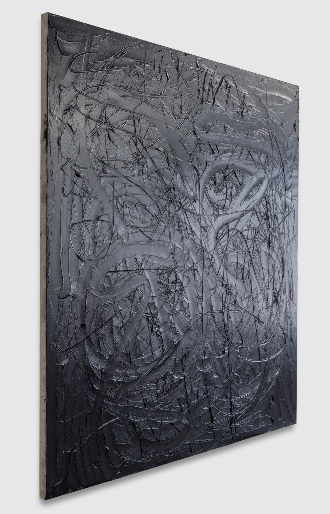 Earthy red, which the artist associates with skins and blood, joins the grey and black abstractions for the first time in the current show. In Wide Red, a swarthy layer of scratched and scarred vermillion paint signals a return to Yossifor’s earliest body of work, a series executed nearly two decades ago from 2002 to 2006, when she was exploring her heritage (see below). Moving away from a kind of figuration that too readily prompted a reductive reading, the Israeli-born artist began to explore other pictorial modes which would allow her to literally dig further into the paint in order to probe deeply embedded meaning.