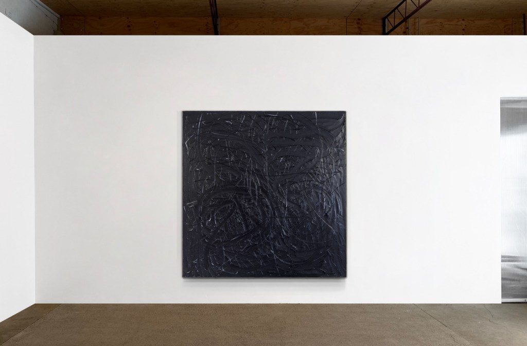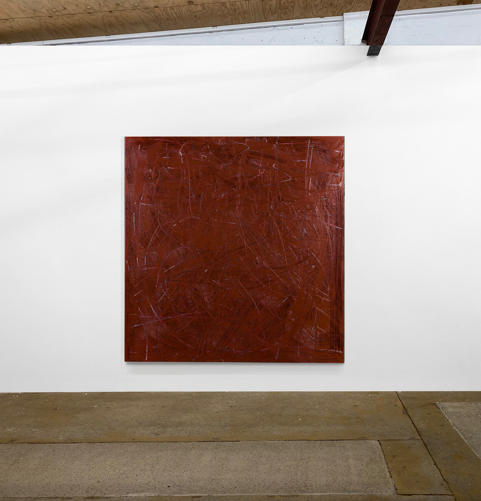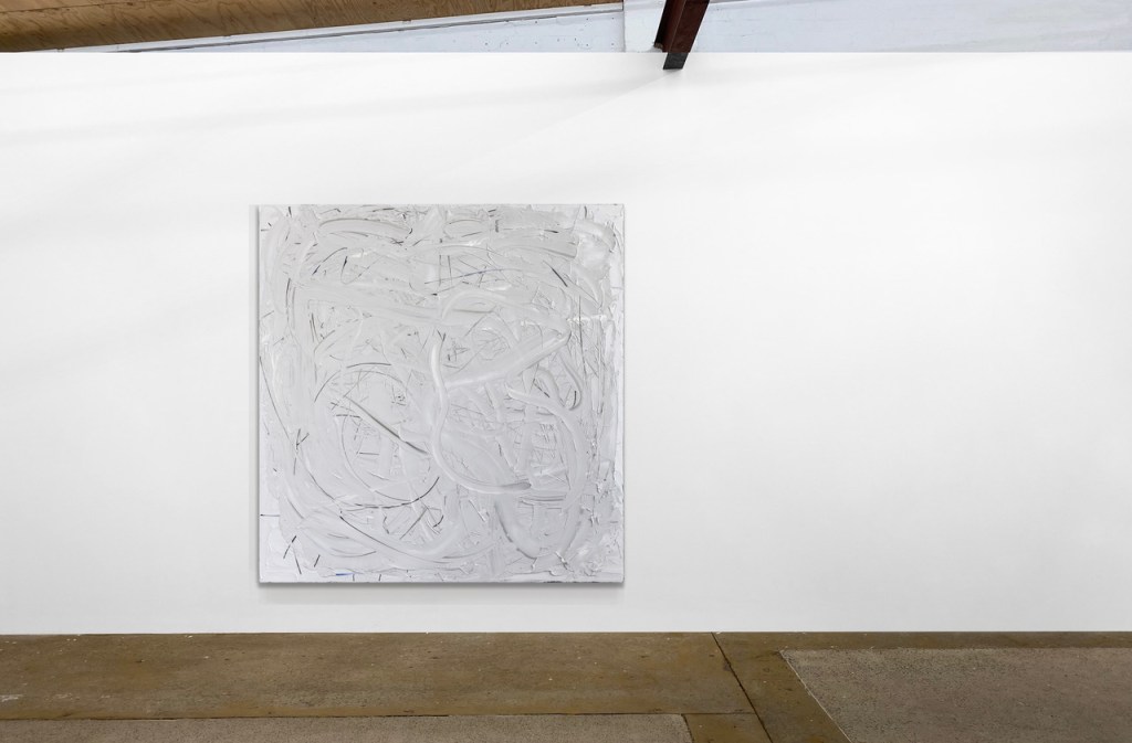 Conceived as an installation intended to invite deambulation and contemplation, her 2020 exhibition “No second chances in the land of a thousand dances,” comprises seven paintings meant to converse across the gallery space. With this recent group of works, Yossifor reintroduces deep red to a minimalist palette that has oscillated between the opaquest of blacks, streaked with swirls of white like shooting stars across a vast night sky, and countless gradations of grey, resulting from tangles of blue, yellow and red folded into the monochrome white ground.