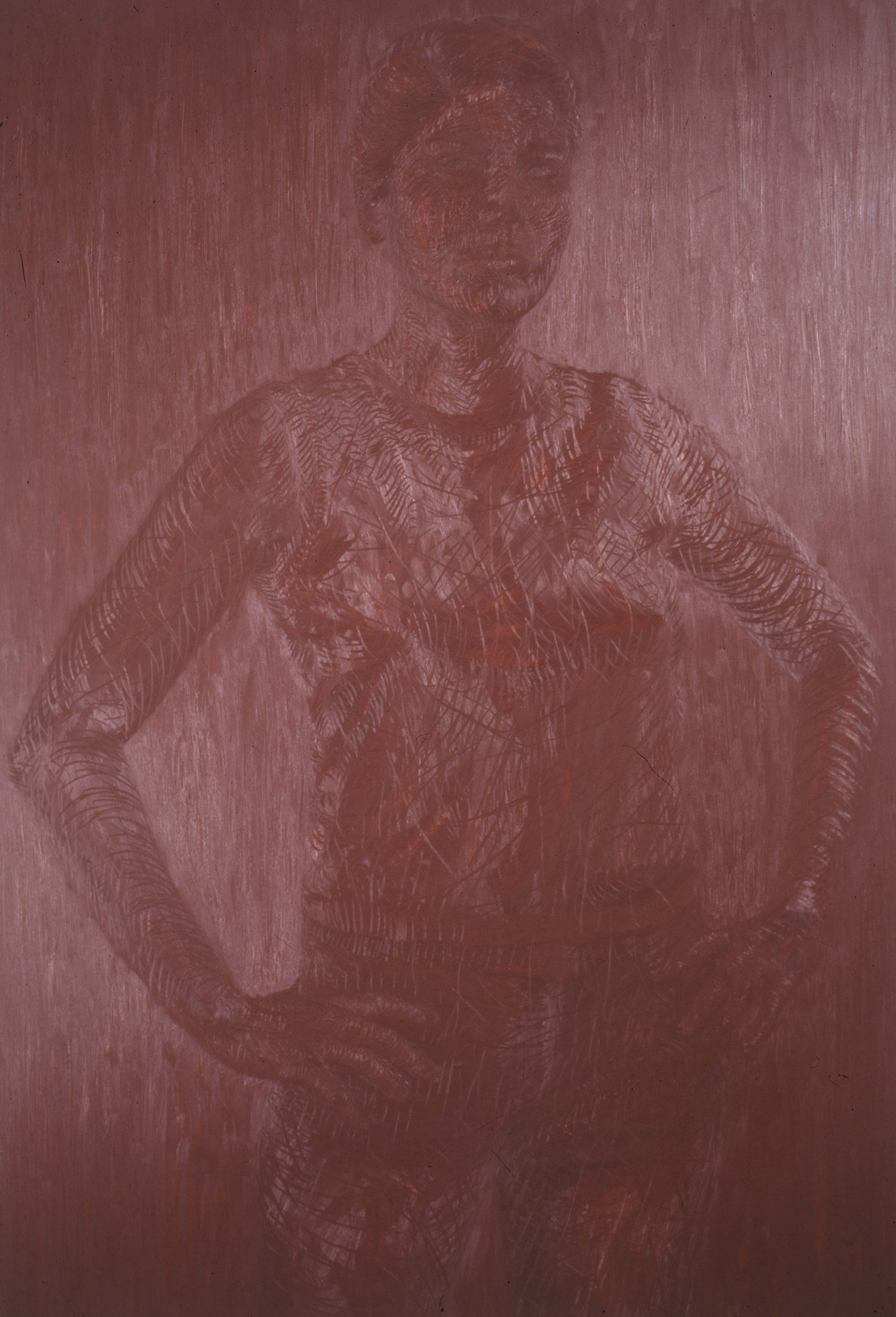 These earlier works are incised into oil paint on board. Twenty-seven half-length, bust or head shots of uniformed young women depict conscripted Israeli soldiers in hues ranging from white and pink to red and black. Crosshatched lines etched into monochromatic fields of color demarcate the spectral figures, which emerge like apparitions from a vertically striated ground, activated by the shifting effects of light. Details of these figurative works display an uncanny resemblance to her new abstractions; the mark-making uniting them bears witness to the continuity of their core concern—embodiment.