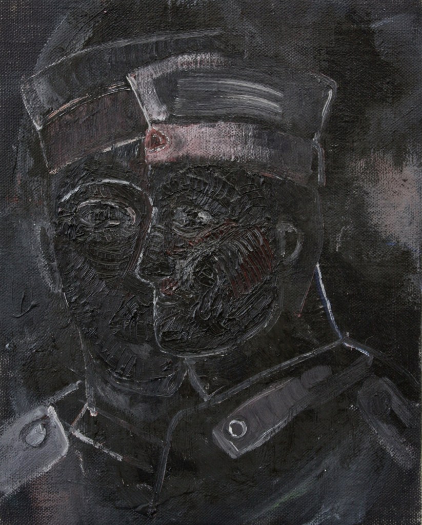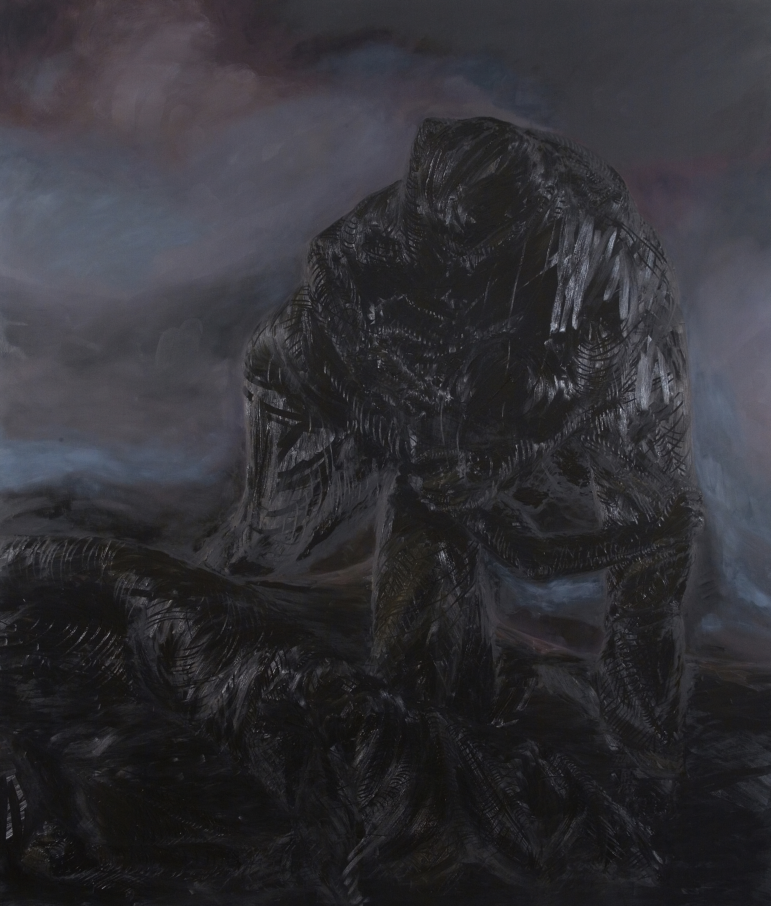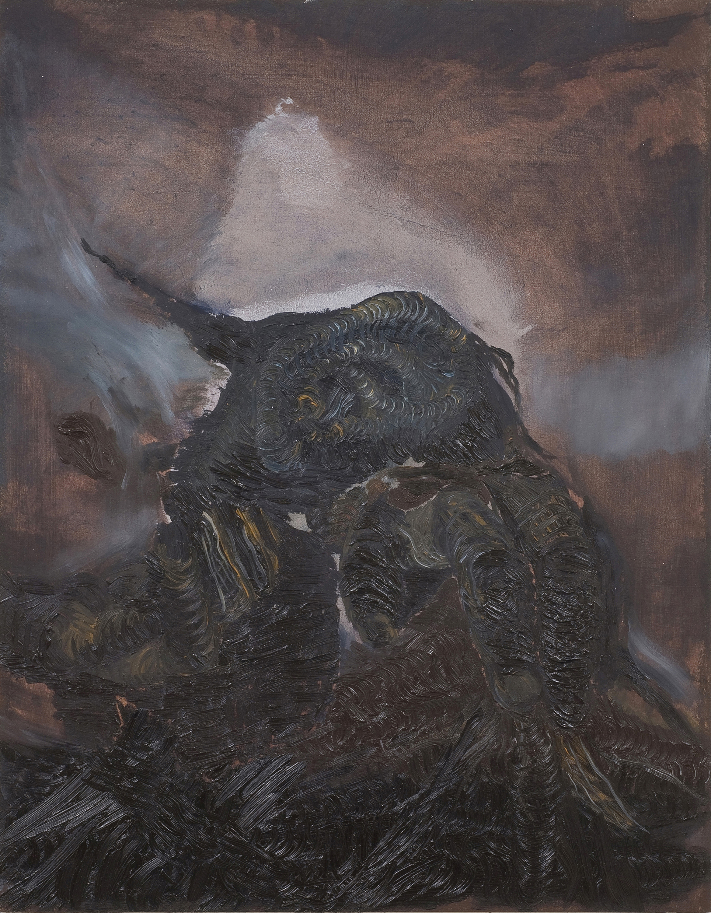 Against moody, dramatic skies, deformed or amorphous black mounds of scored paint merge into the monstrous foreboding landscape. Conjuring a mass of maimed, mutilated, dying and dead bodies, the central motif is an allegorical battleground on which the metaphysical and the visceral face off. The pictorial plane constitutes the stage where the artist grapples with the multifarious dimensions of perception, identity and perspective. Alluding to similar questions linking nationality, nation, and nationalism to incipient violence, Double Headed (2010) (below), offers yet another, although distinctive, bridge between the earliest and most recent bodies of work.