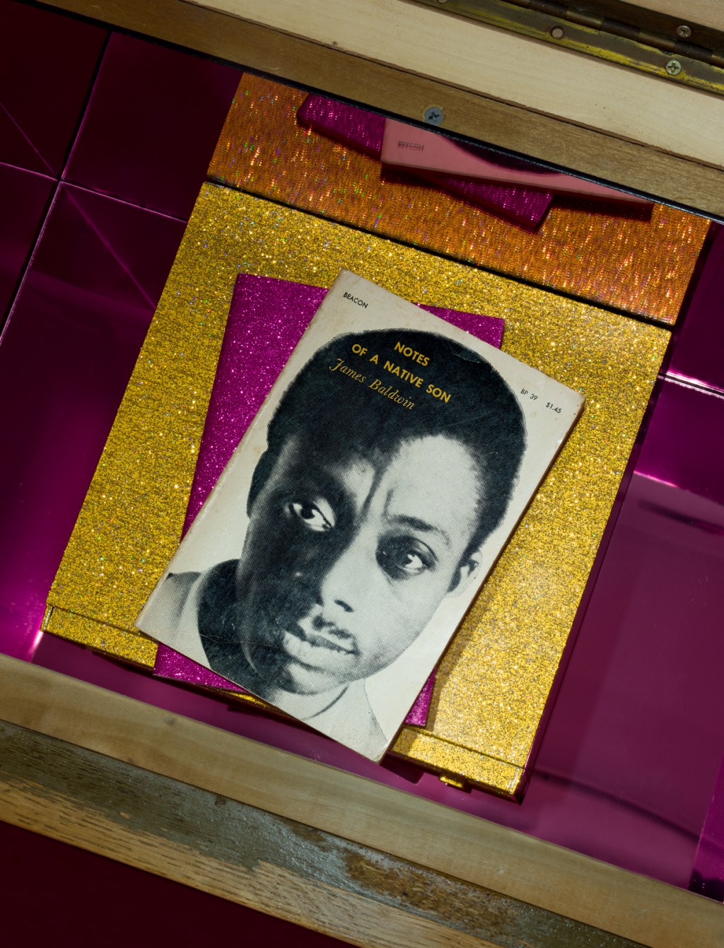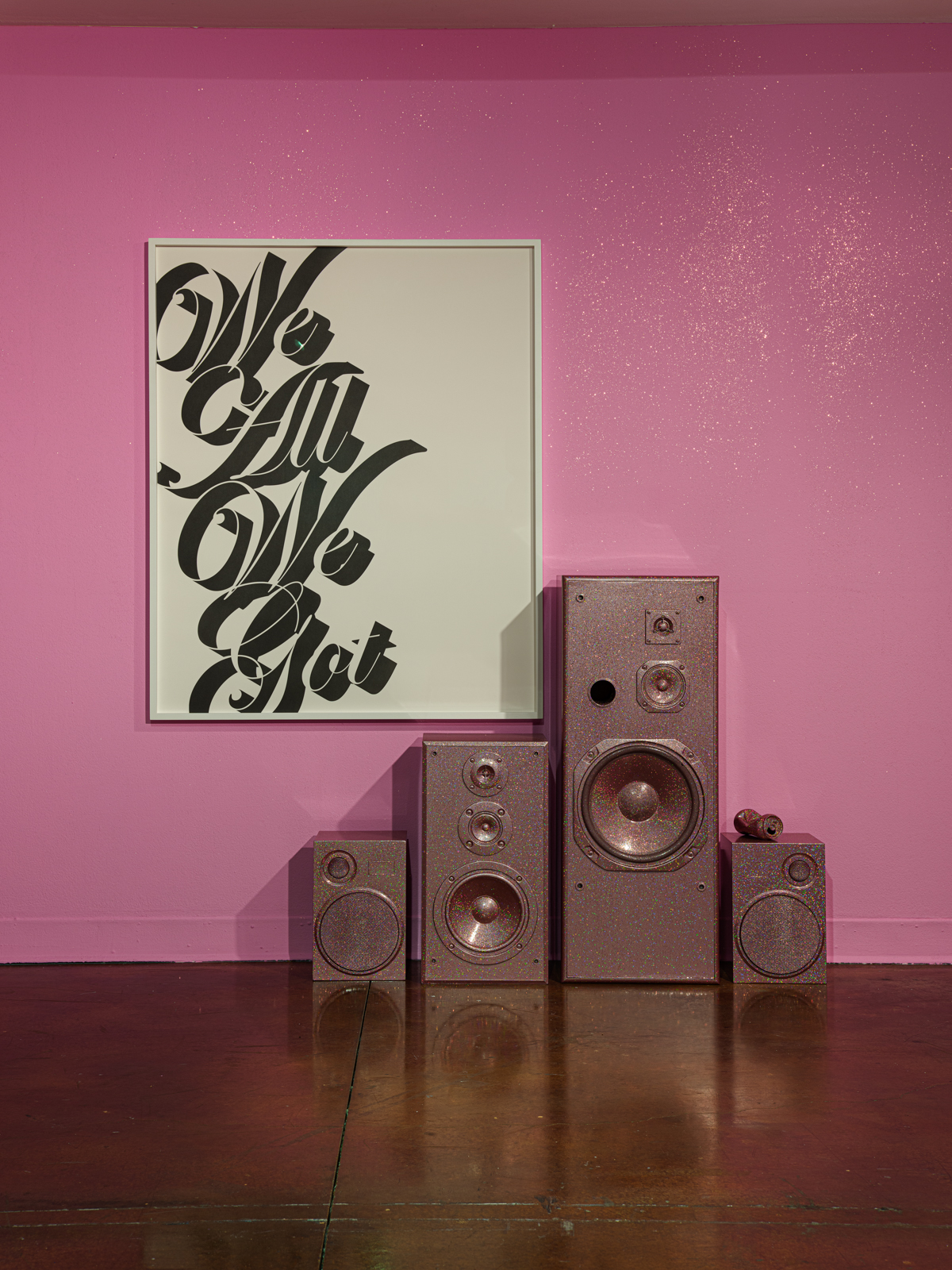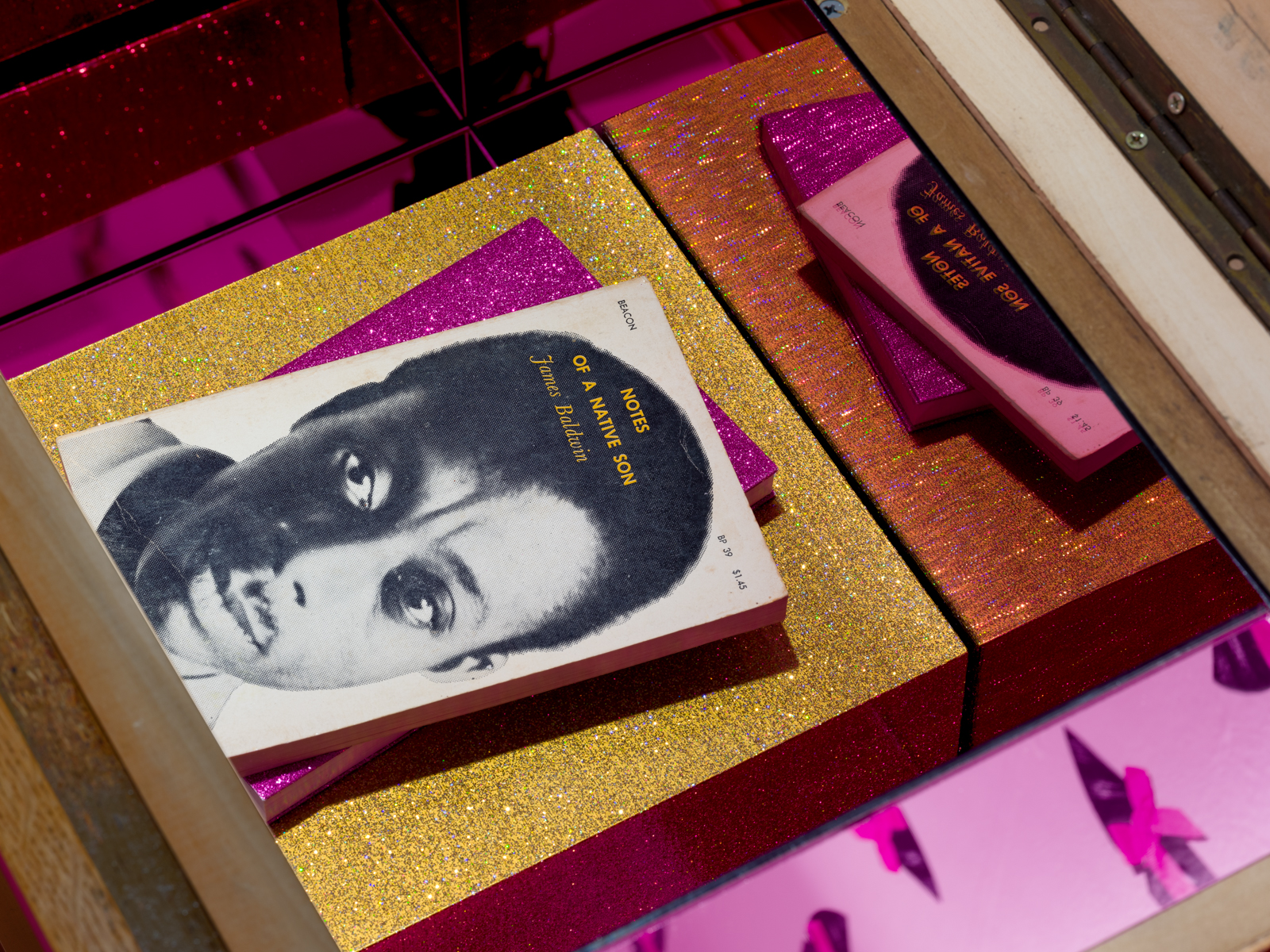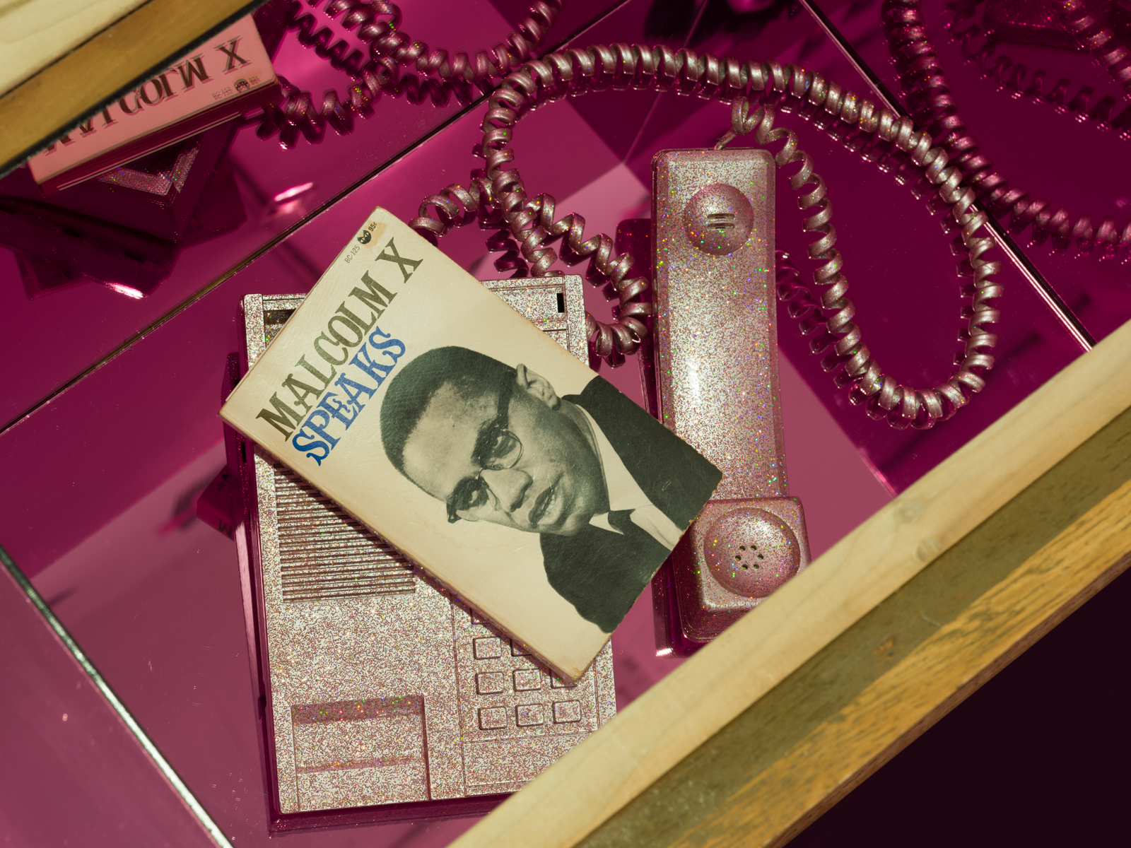 Barnette hand-picked the second site for Legacy & Legend at Pitzer College Art Galleries. Tucked away on Pitzer College’s campus, this space’s low concrete ceilings and virtually no windows contradicts that of the Benton’s. Similar to her prior work, Barnette uses this space to reimagine her past concurrently with the present and the future by intersecting reminiscences of her childhood and family with futuristic holographic materials. Barnette capitalizes on the cozy, intimate space by including domestic staples such as a stereo set, a couch with a childhood photo of herself positioned above it, and a large image of young teens & adults, including her father, facing it. These images and several others hung throughout recreate the nostalgic experience of flipping through old family photo albums. However, because of the glittery and holographic alterations made to the couch and stereo speakers, the audience is faced with a conflicting presentation of Barnette’s story—Are we looking at the present? Or is this the future? Even further, the wallpaper comprised of ribbon-wrapped piks (a special comb for Black hair), drawings bearing hand-inscribed slogans reading “single working mom’s princess,” “sister-sister,” and “we all we got,” and copies of Malcolm X and James Baldwin books feels like a reimagination of Black childhood that extends far beyond Barnette’s own. Prior to Barnette’s, I had never experienced an exhibition that could show audiences glimpses into Black youth that, to me, felt genuine rather than exaggerated or fabricated to please non-Black audiences. Because of this, I feel this portion of Legacy & Legend revealed Barnette’s incredible ability to create spaces that harness Black joy and family memories.