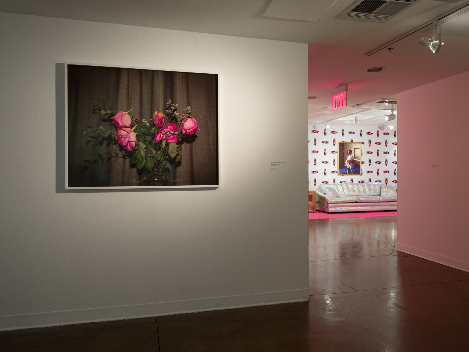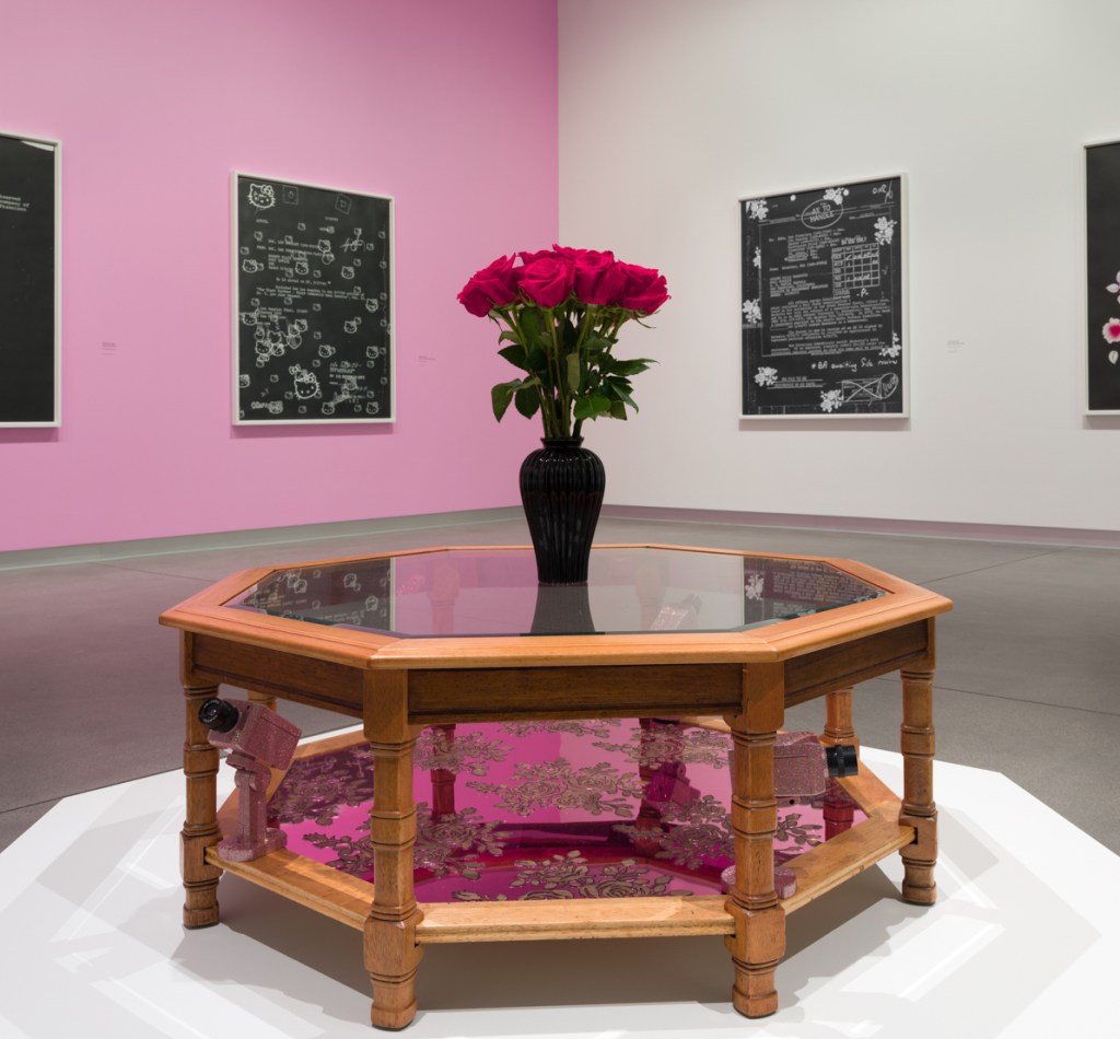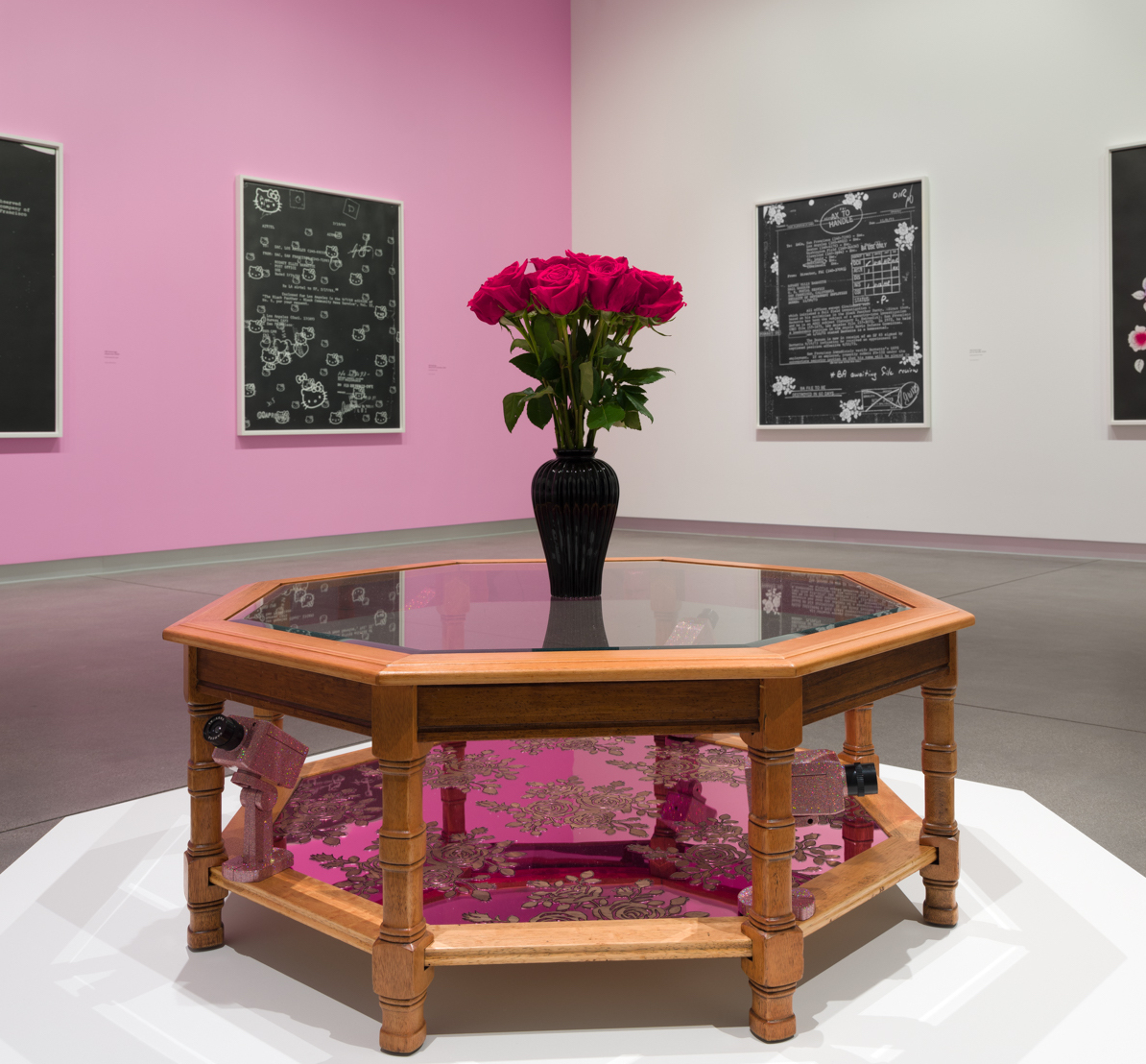 The Benton Museum at Pomona College houses one half of Legacy & Legend. Barnette juxtaposes the open, sun-lit white-cube gallery space with clashing yet oddly complementing bubblegum pink walls, which hold up the enormous pieces from the aforementioned FBI Drawings—including Rodney Barnette’s mugshot decorated with flowers. At the center of the room rests a wood and glass coffee table with glittering surveillance cameras and a vase of flowers in the center. The nature of the documents, presence of cameras, and the general openness of the museum space create and support the eminent themes of violence and surveillance throughout the exhibition.
